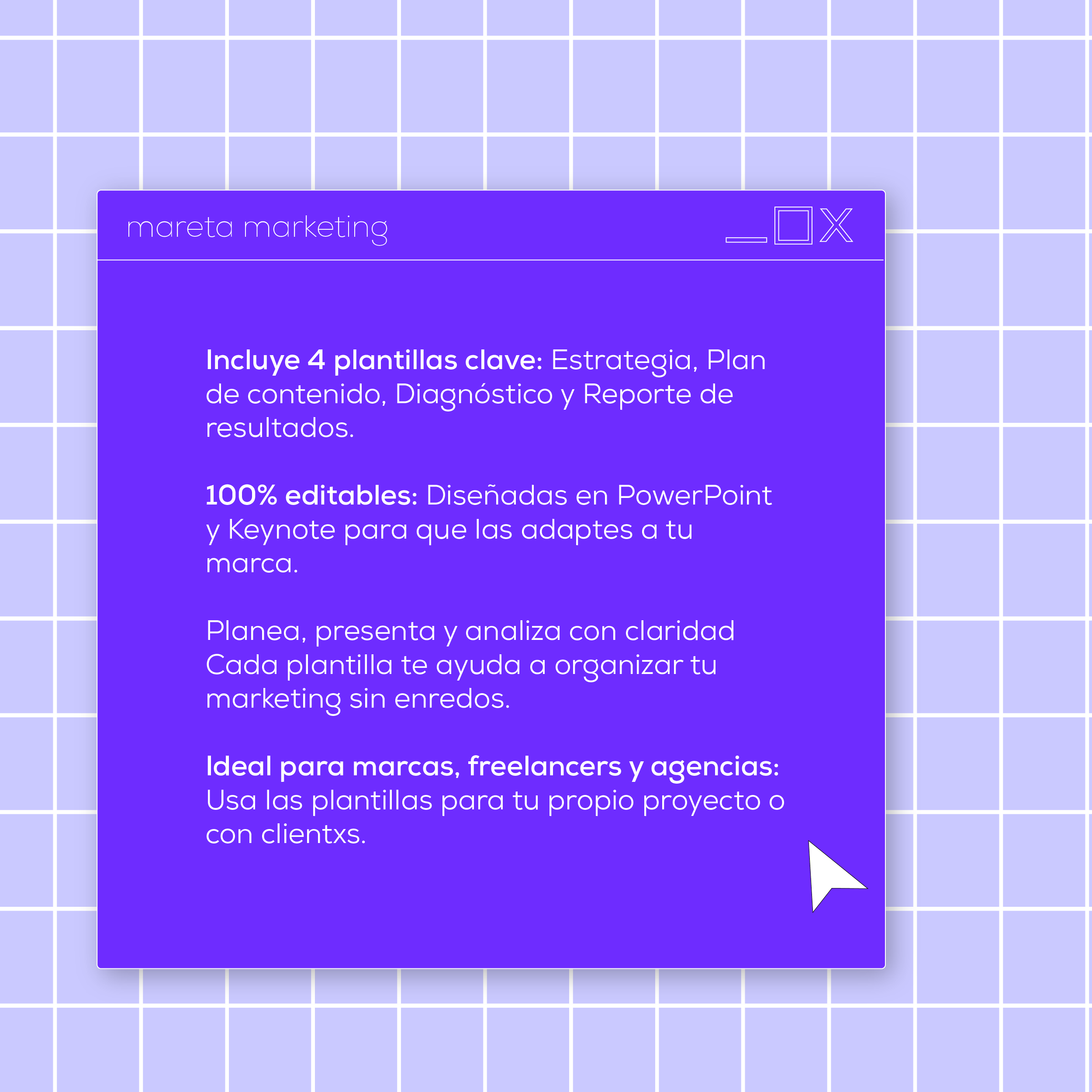 Hazte la vida más fácil. Usa herramientas visuales y funcionales que te ayuden a comunicar con estrategia.✨ Mareta Marketing ya lo pensó todo, tú solo tienes que llenarlo.