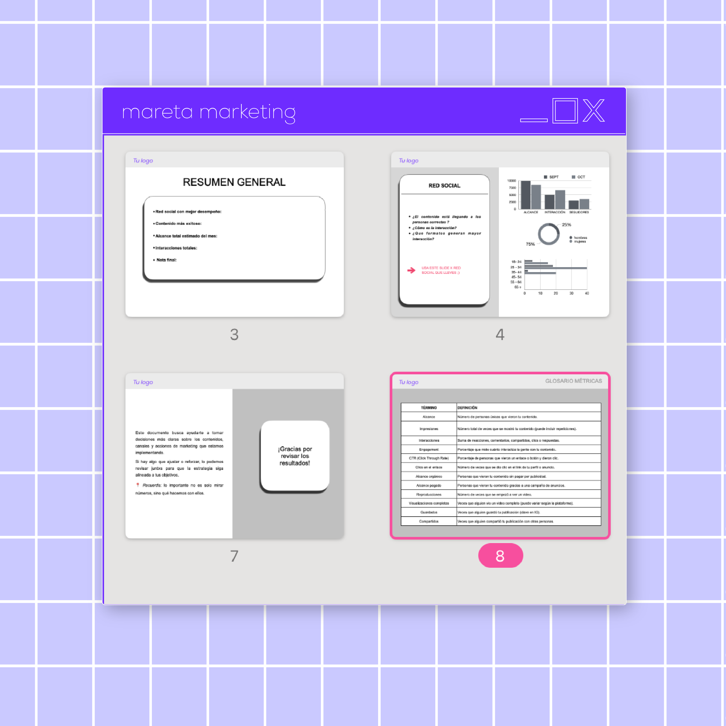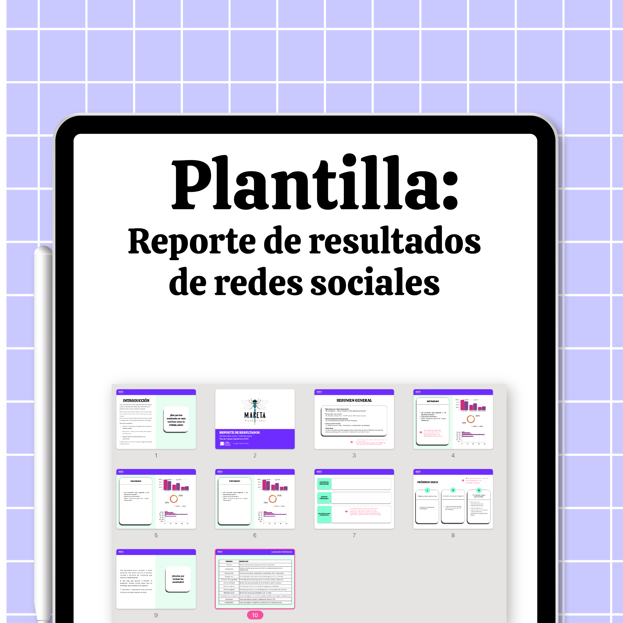 Presenta los resultados de tus campañas o contenido en redes sociales de forma clara y visual. Incluye guía de uso + plantilla editable.